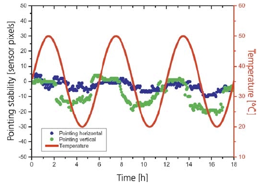 圖1:上左圖:HTCure工藝的激光器在20-50℃溫度擾動下的噪聲表現; 上右圖: HTCure工藝的激光器在20-50℃溫度擾動,及快速開關下的功率穩定性表現。下圖:HTCure工藝的激光器在20-50℃溫度擾動下,指向穩定性的測試數據(< 4 μrad/℃)。