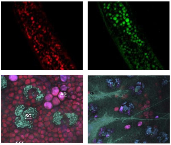 | NOCTUA顯微鏡系統(tǒng)允許在生理相關(guān)條件下對(duì)結(jié)構(gòu)和事件進(jìn)行成像,這是熒光標(biāo)記無法達(dá)到的。SRS圖像顯示了秀麗隱桿線蟲中的不飽和脂肪酸和膽固醇(上圖)。下圖顯示了小鼠耳朵皮膚中由脂質(zhì)形成的真皮結(jié)構(gòu)(左)和局部應(yīng)用的未標(biāo)記藥物穿透皮膚(右)。 | ![]() |