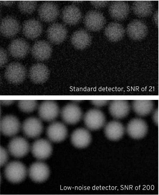 如下圖所示,我們的光纖耦合平衡探測(cè)器實(shí)現(xiàn)了10 dBc的噪聲抑制。為了說明這一點(diǎn),右上角的圖顯示了使用標(biāo)準(zhǔn)檢測(cè)器獲得的信噪比為21的塑料珠的SRS圖像。相比之下,右下方的圖顯示了使用我們的低噪聲探測(cè)器獲得的相同圖像,其SNR改進(jìn)為200。 |