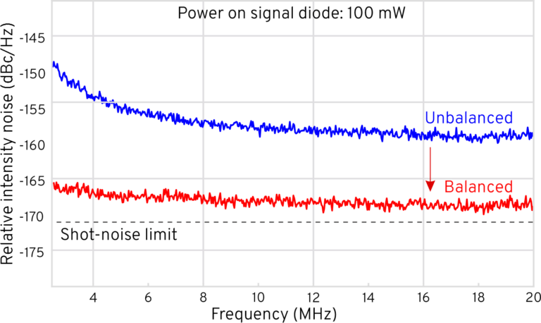 | 為了克服激光噪聲,這通常會(huì)阻止成像系統(tǒng)達(dá)到理論散粒噪聲極限,我們使用了平衡探測(cè)器。通過測(cè)量參考光束中的激光噪聲并在樣品后從SRS信號(hào)中減去它,噪聲被抵消,從而提高信噪比和成像速度。