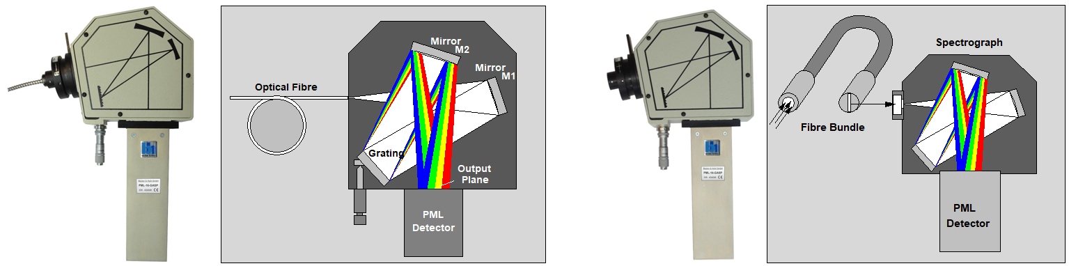 PML-SPEC 和 MW-FLIM 多光譜探測器將 PML-16 16 通道PMT探測器與小型光譜儀結合使用。光譜儀在探測器上投射光信號的光譜,到達PMT通道的信號被記錄在多維TCSPC模塊的單獨存儲塊中。